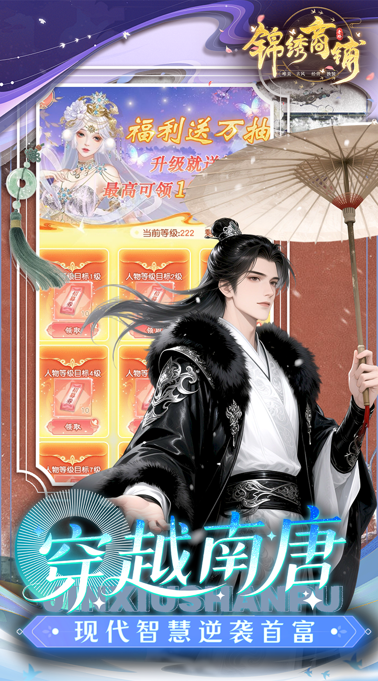 ★【进游福利】进游送66666钻石,新手送头像、相框、气泡盲盒三件套 ★【礼包福利】白手起家送橙色门客绾绾,等级升级送坐骑海棠辇 ★【海量充值】签到、活跃送万元充值卡、每日在线领千元充值卡 ★【抽充大礼】升级送10000抽,签到、七日登录送2500元真充卡 ★【贵族福利】开局送至VIP8,免费激活V1-V8所有特权 ★【经商之道】完成赚钱目标可获得海量真充卡,真充卡可升级VIP ★【合成特技】天命系统开启充值卡合成真充卡功能,轻松满V不是梦 ★【定制传闻】商海沉浮一战成名,全服广播,巨星霸屏 ★ 全场充值0.1折,充值648元仅需6.48元