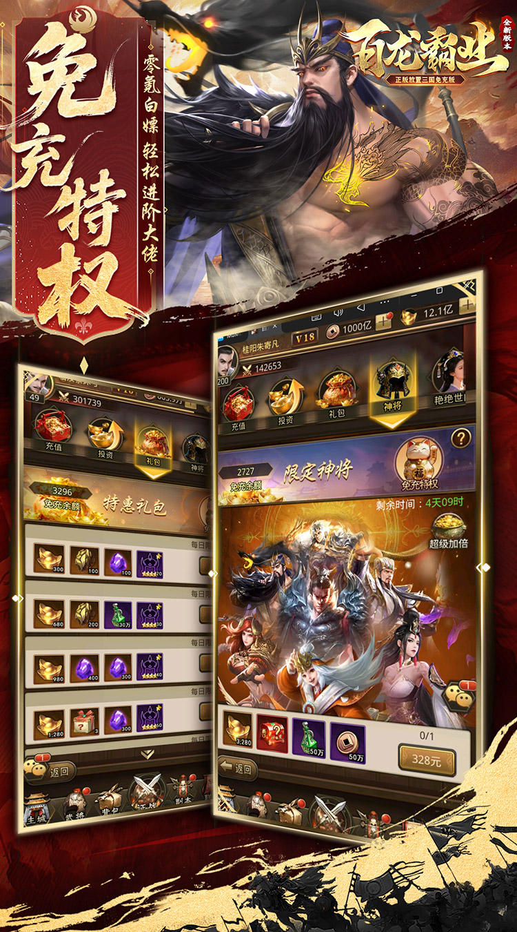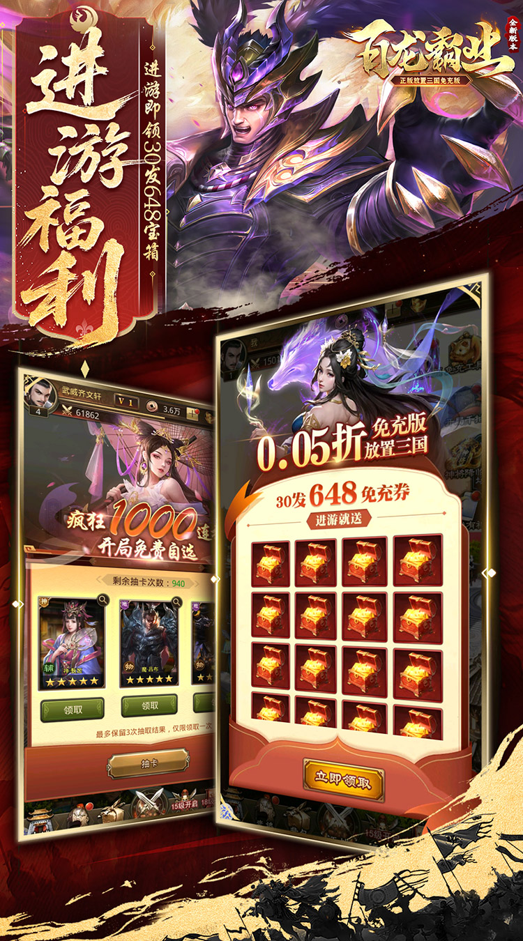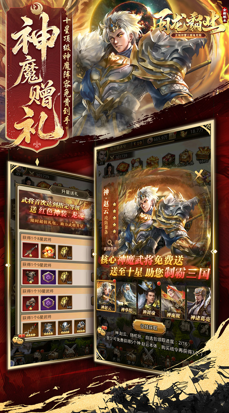 ★充值比例1:10 ,货币:元宝 ★【进游福利】创角福利焕新,进游就送30发648免充券! ★【免充工具】全新免充版本来袭,每日活跃得免充额度,豪礼礼包免费领,零氪也能当大佬! ★【时空红颜】私密红颜邀您结缘,邂逅佳人夜话星河,解锁永久属性! ★【神将降临】核心神魔阵容免费送至10星,助你横扫三国,制霸全服! ★【千抽大礼】进游就送1000连抽,挑选你的心意武将,三国霸业开局即燃! ★【七日登录】登录送大量元宝、神级套装、神魔自选武将,连续四周福利加码,助你逐鹿中原! ★【通关豪礼】通关必得红色套装、海量道具,培养武将快人一步! ★【神魔置换】三国卡牌大革新,武将置换化神魔!畅享独特玩法,征服三国乱世!