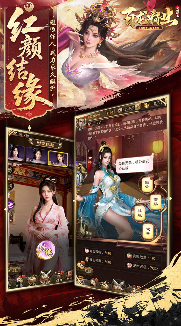 《百龙霸业》是一款三国题材的卡牌放置手游,玩家扮演主公,招募三国名将,通过策略搭配和养成来增强自己的阵容。游戏特色包括丰富的武将系统、自动战斗的竖版回合制玩法、多样的布阵策略以及神兵系统,为武将提供额外增益。玩家可以体验到离线收益,即使不在线也能获得资源,享受轻松休闲的游戏体验。
