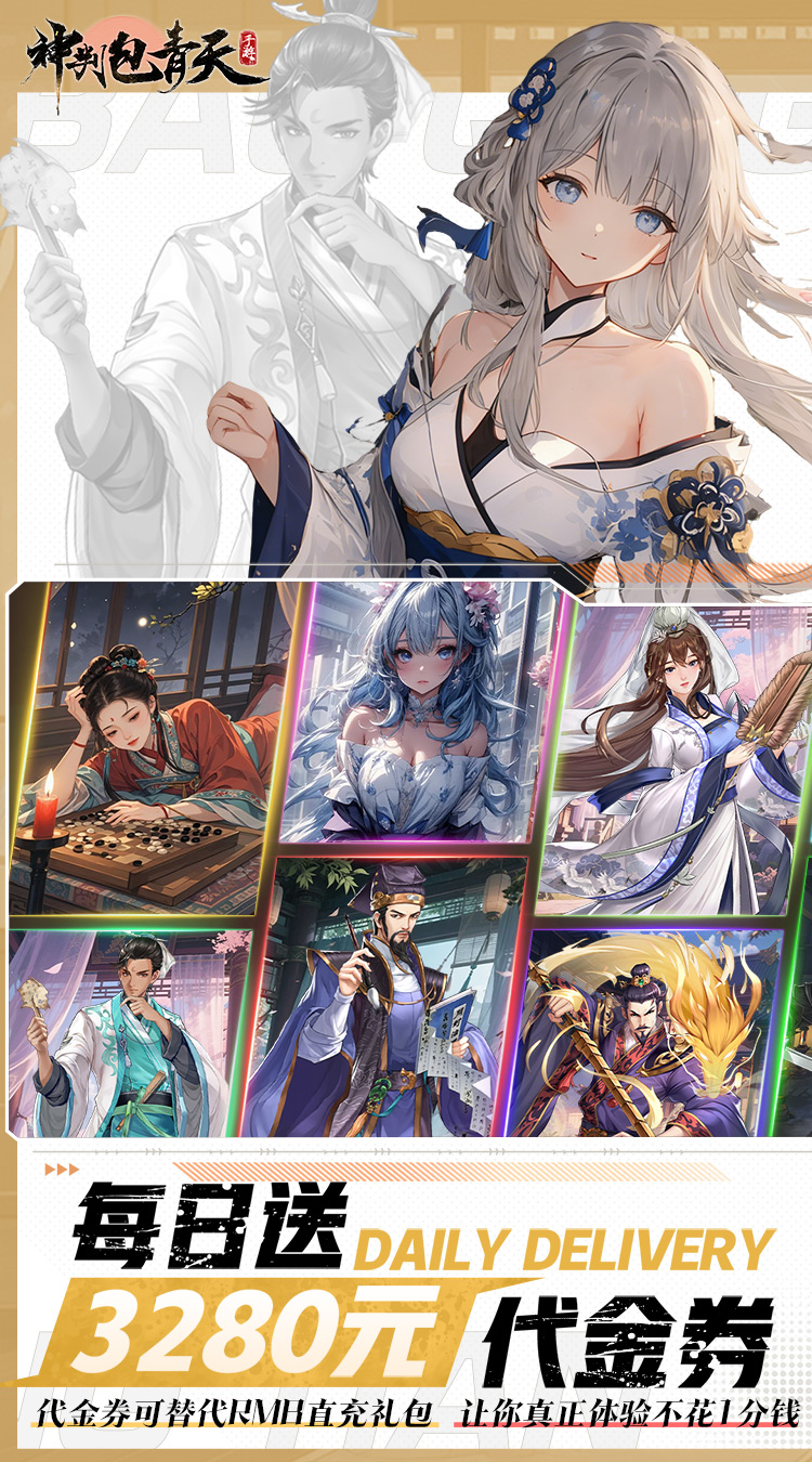 ★【每日3280元】免费赠送“3280特权”每日登录邮件免费领取3280元代金券(代金券可拆分:替代RMB直充礼包),让你真正体验不花1分钱也能玩! ★【创角福利】创角即送:少年包拯*3个、韩琪*1个、888元充值卡、高级装备宝箱*1、金锭礼包*20 ★【7日福利】送3350客店招募令抽奖,再送开封府军巡判官“王朝马汉*4个”、“张龙赵虎*6个” ★【豪杰赠送】免费赠送“核心英雄5人组:送至至尊、聚势登峰”,不用花钱也体验巅峰快感 ★【日送2千】累计在线时长活跃送“1700元充值卡”在线转盘再送“1000元充值卡” ★【送万元充】每天累计签到可免费领取“4万元充值卡” ★【无限充值】推主线闯关无限掉落充值卡