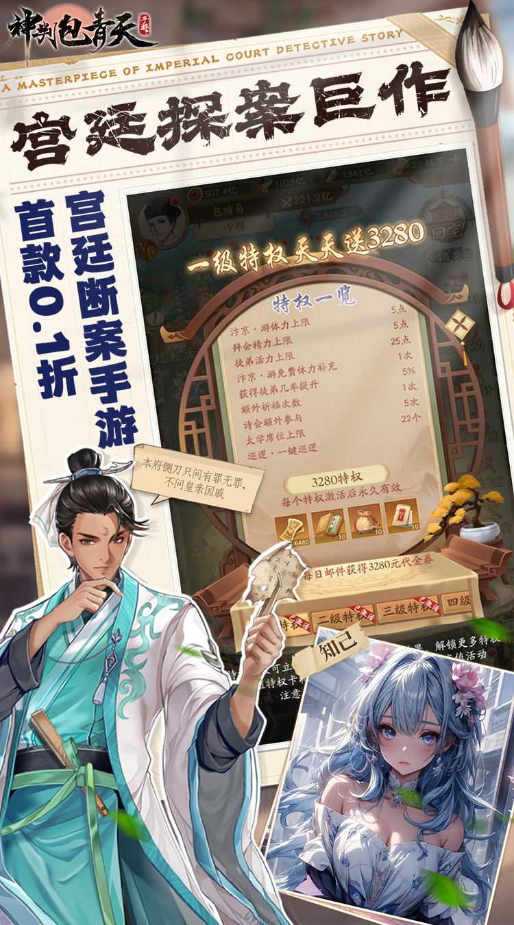 《神判包青天0.1》是一款特别经典的角色扮演类以宫廷体验为原型的官场手游游戏,玩家在这里将扮演包青天,跟随故事剧情微服出访,体察民情,并且能够秉公办理案件,利用自己的聪明才智寻找更多的线索,破获更多的案件惩奸除恶,铁面无私,宫廷斗争美女相伴自由行,多样挑战无尽美女在身边;绝世美女相伴去组队,经营资源获得更多的财富;萌萌时装等你切换,自由模式快乐无限,新官走马上任,英雄豪杰与你联合,尽情体验破案给我们带来的乐趣。
