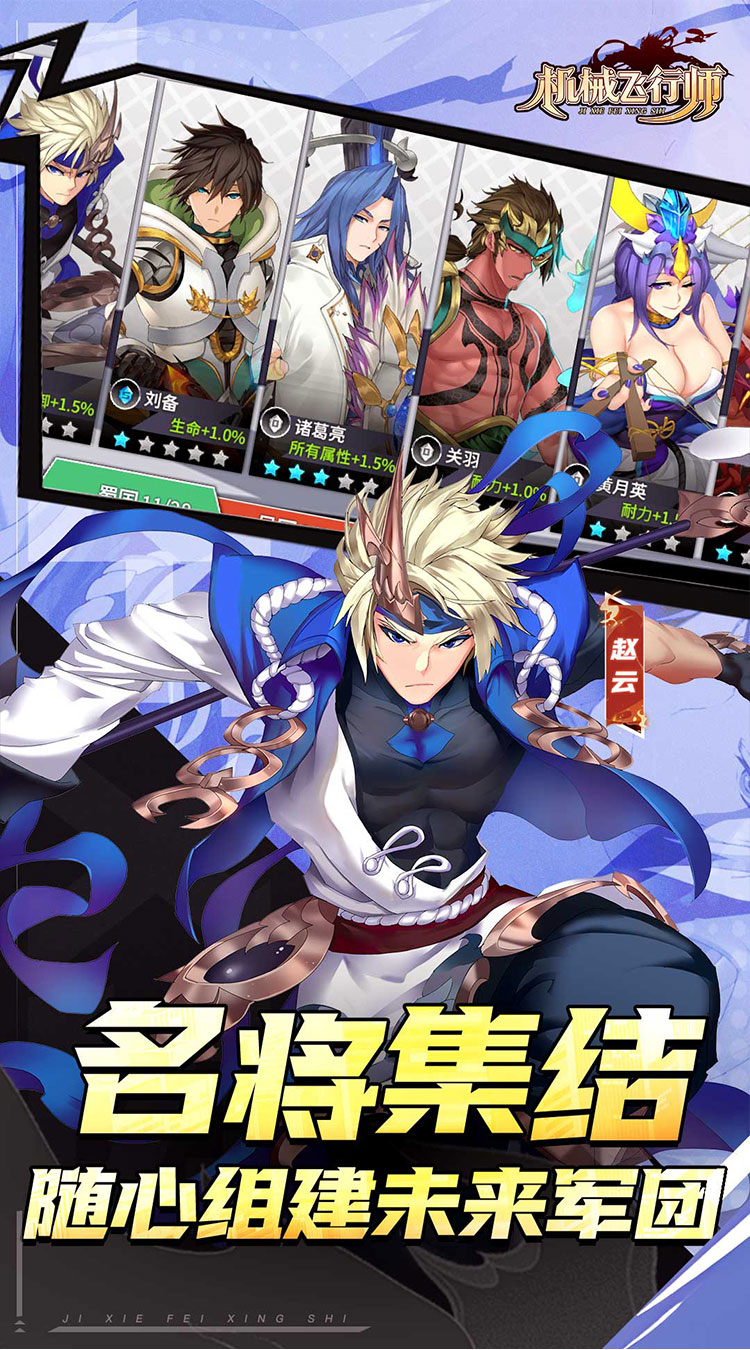 机械飞行师(0.1ACT机甲三国)是一款融合科幻机甲与三国题材的横版动作手游。登录即送核心名将,化身机甲武圣横扫战场!充值享受震撼比例,全场消费0.1折起,轻松获取海量养成资源。体验无限浮空连招,感受拳拳到肉的割草快感;自由收集与养成未来名将,组建你的无敌军团。福利助力,战力飙升,立即踏入这场炫酷的赛博三国乱世,书写你的超杀传奇!