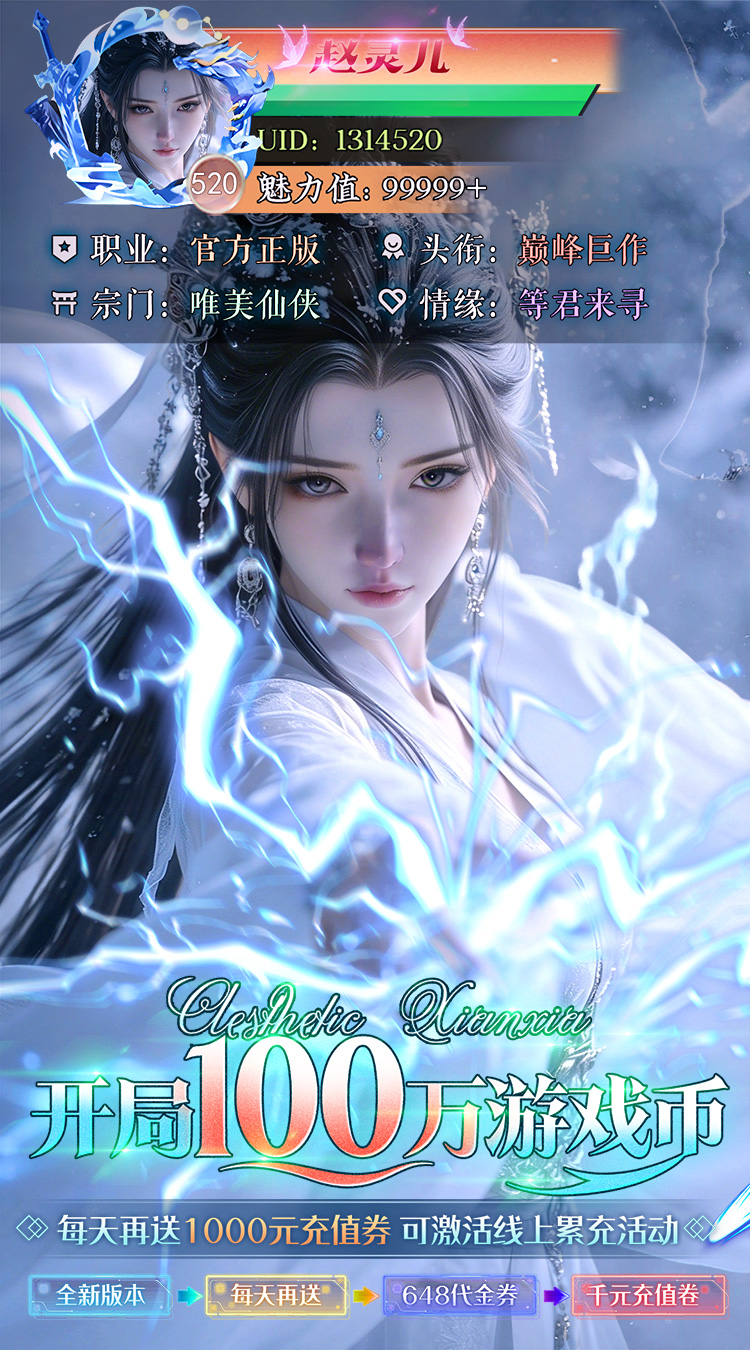 ★【开局100万游戏币】创角即可免费领取礼包码兑换“100万游戏币(价值:1000元实付)”策划小弟承诺:绝不花1分钱! ★【创角即送】霸气外观:金坐麒麟、千年神鲲、灵光神鹿、炼狱噬魂衣、五条悟,1000元充值卷、进阶礼包*2000 ★【开服送礼】12个头像框 11个气泡框,丹药990 宝石990 进阶礼包9990 元宝88888 6480灵玉卡 扩展行囊*250 ★【策划承诺】游戏内所有充值通通0.1折,原汁原味0.1版本,物价完全保持原价,原几千元神藏套装仅需几十元 ★【每日千元】日常活跃可免费领取“1000元充值卷(每日免费获取)” 1比1还原真实充值 ★【每天648元代金券】每天再送648元代金券(每天在平台领取)可充值线上直购 ★【秒杀快感】新增BOSS秒杀功能,真正体验刚出刀BOSS就挂了的爽感 ★【版本更新】版本持续迭代,每周更新:新功能、新玩法、新福利 ★【神魔系统】一念成神,一念成魔,我命由我不由天,任君选择 ★【每日签到】每天可以领取百元“充值卷”1比1还原真实充值 ★【魔王boss】刷BOSS无限白嫖高级幻化套装、绝不花1分钱 ★【福利礼包】几十种免费礼包码,将不断重新更新替换 ★【七日登录】送多种外观,免费领取“2000元充值卷” ★【官方正版】顶级巅峰巨作:唯美仙侠手游