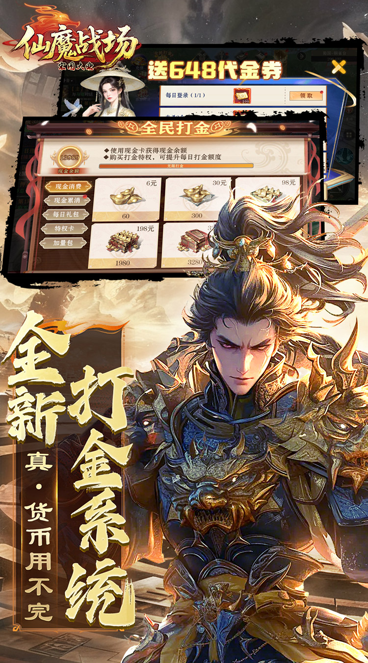 1、创角送福利,绝版称号、高额属性丹和海量资源拿到手软! 2、全民全新无限打金系统,元宝金子用不完 3、登录即送SSR名将-关羽,在线还能领现金红包 4、每天领648代金券,不用充钱也能买买买 5、升级送千抽,一直升级一直抽,无数名将轻松收入囊中 6、刷怪掉红包,每分每秒都在赚钱!