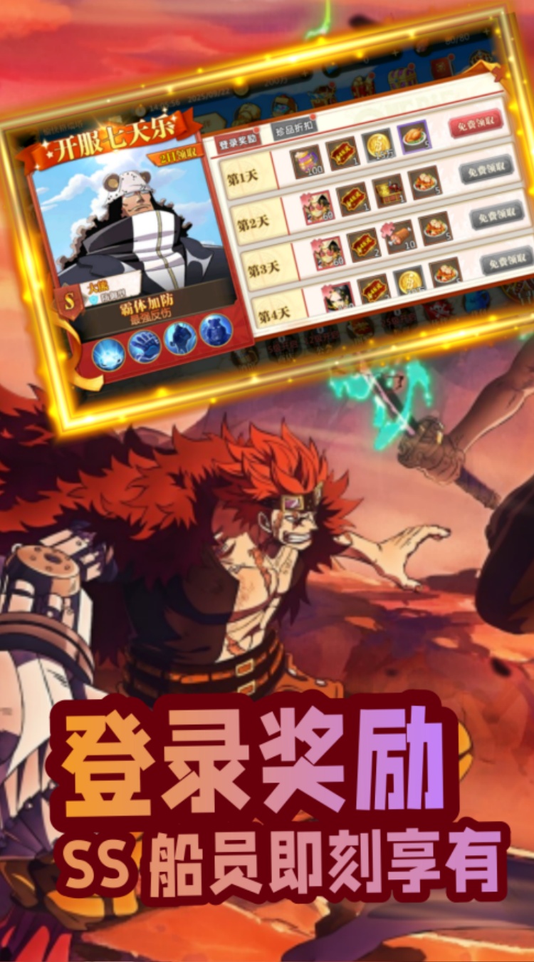 1、充值比例1:10,首续充值0.05折; 2、创角赠送SS随机英雄X4,金币200万,盛宴全鸡*10; 3、上线赠送VIP6、每日签到赠送2000代金券; 4、新手狂欢,完成任务赠送SS伙伴香克斯以及专属藏品; 5、七日签到,每日赠送强力SS伙伴和648元充值卡;