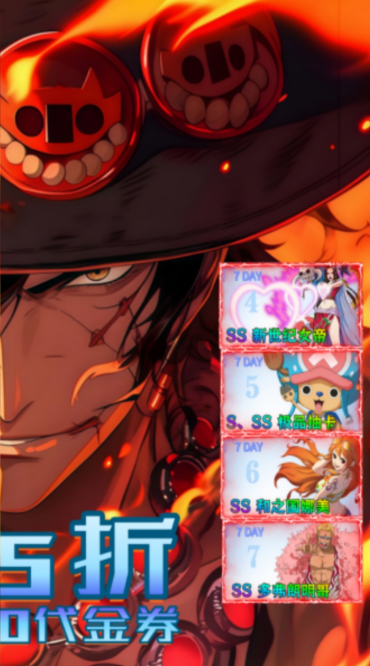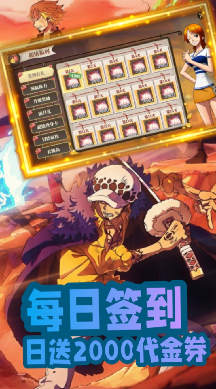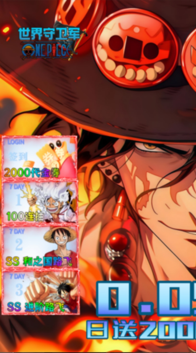 世界守卫军(0.05折日送2000代金券)是一款正版横版海贼卡牌游戏!游戏内真实还原了路飞一路成长的历程,一路挑战各个关卡,收入各个动漫里面脍炙人口的人物作为自己的伙伴,一起征战新世界!新版百万代金版本强势来袭,首续充值0.05折,每日签到赠送2000代金券,爽玩停不下来;七天奖、新手狂欢、升级奖励、满月礼等大量福利活动,送超多充值卡、体力、抽卡等战力道具;这个海贼王卡牌手游,真的好玩!爱玩!