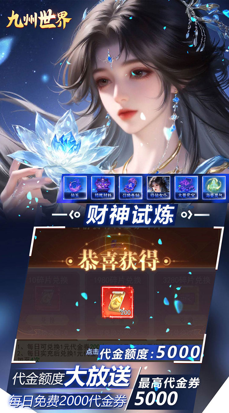 ★【白嫖狂喜】:千元代金券天天送,让您充值无烦恼! ★【进游惊喜】:登录送VIP10、限定称号、SSSR神将免费送! ★【超爽打金】:打金领金票,极品装备海量材料免费换! ★【闯关有礼】:仙玉无限爆,百万真充闯关送! ★【签到福利】:签到送顶级翅膀、酷炫坐骑、更有极品装备!
