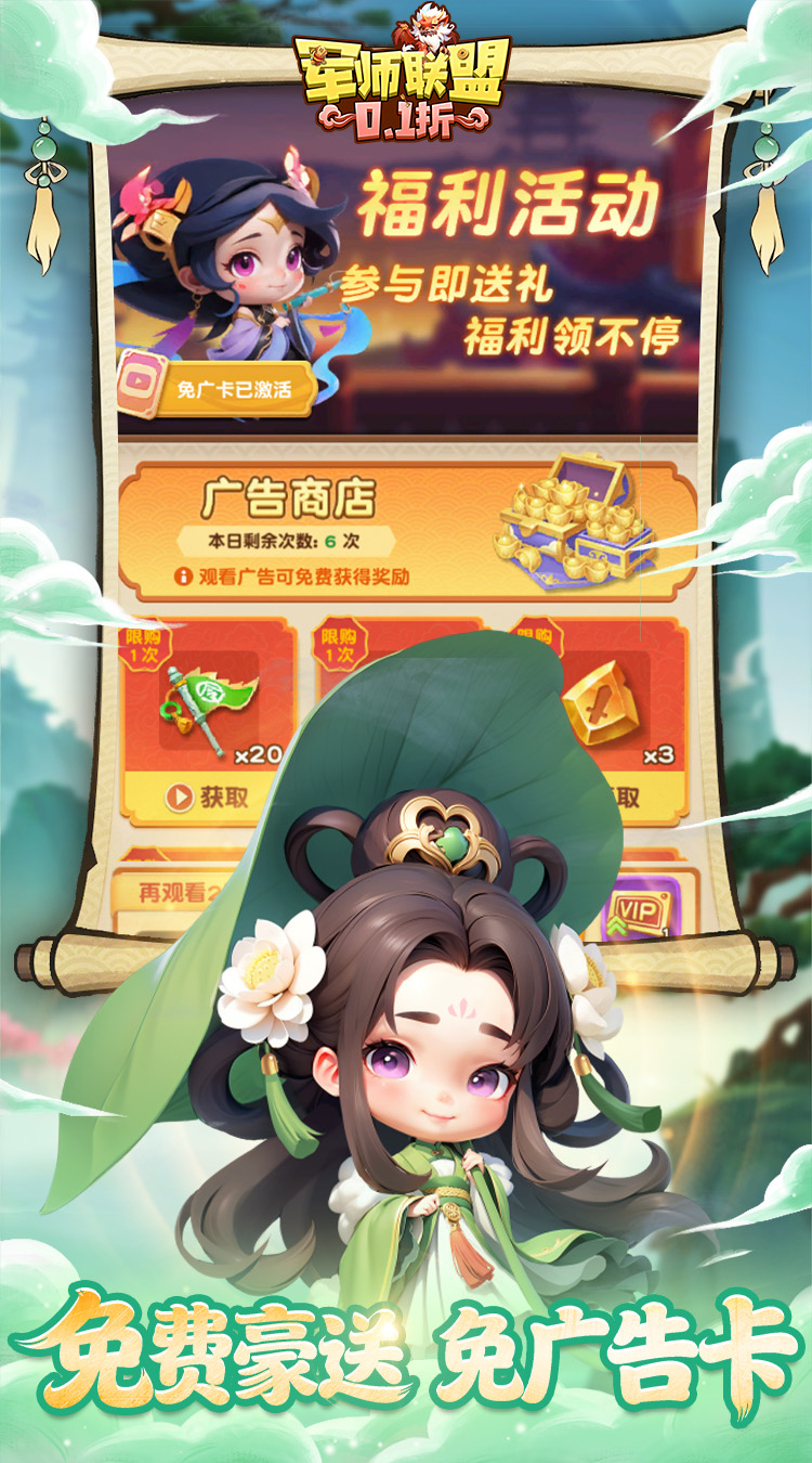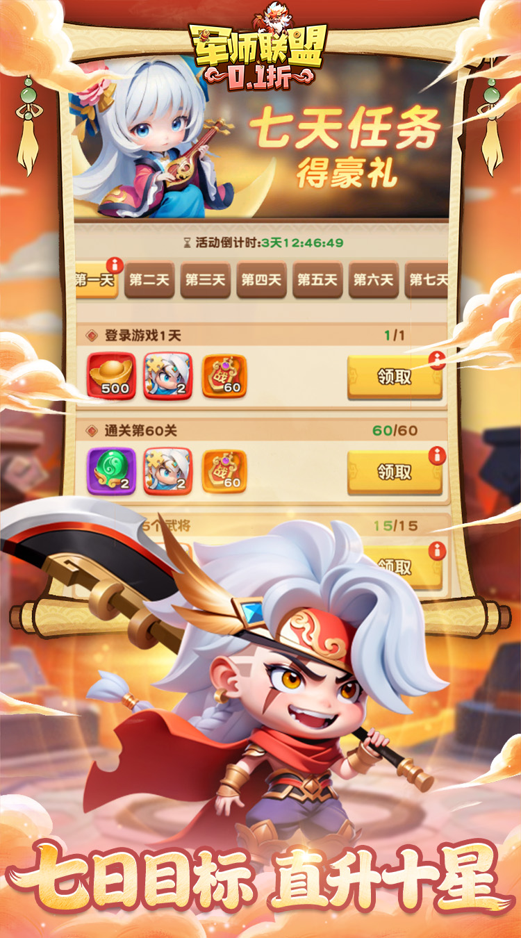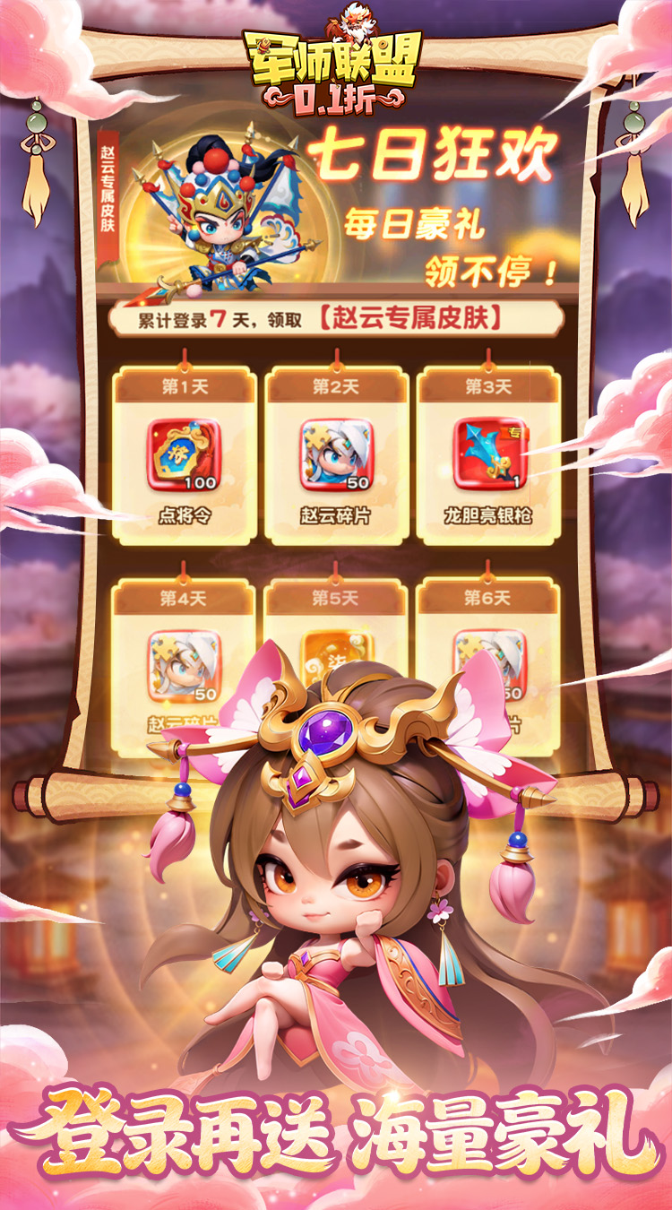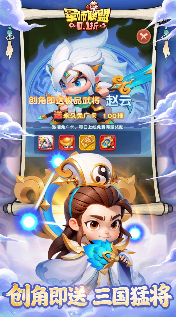 ★【策划买单】创角即送648不限时代金券,永久不过期随心用 ★【真实代金】天天送328不限时代金券,可囤积想用即用 ★【礼包买断】购买3次8.88元买断礼包,即可永久每天领888不限时代金券 ★【上线豪礼】上线即送极品武将赵云*1、元宝*6480、永久免广卡*1、点将令*100 ★【福利加码】每日活跃再领100不限时代金券,每周活跃再送648不限时代金券 ★【七日登录】七日登录送赵云专属神器+赵云限定皮肤-戏外王将 ★【七日目标】开服七日冲目标,赵云直升10星战力狂飙
