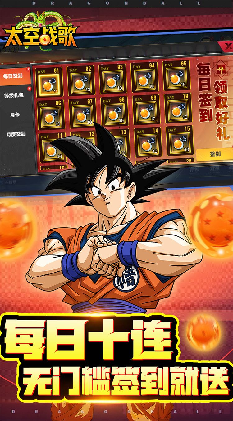 1.创角送悟空,胖布偶,人造人18号和等级红包 2.登录完成任务领取千抽 3.每日签到送10连抽 4.7天登录送随心招募机,抽到满意为止! 5.首充0.06元送超值红装!