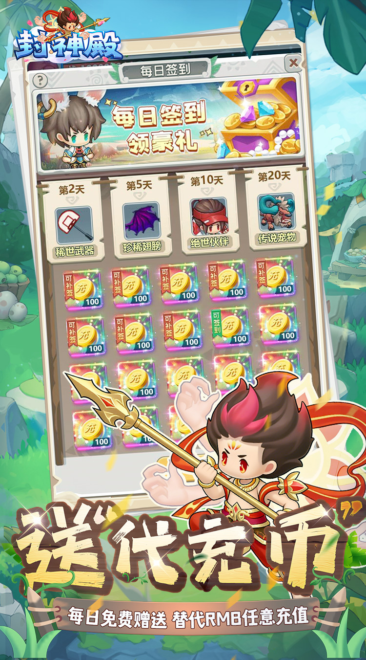 ★【送代金券】每日免费赠送“648元无门槛代金券”可在游戏内任意充值货币档位、直购等礼包,绝不花1分钱 ★【福利全开】闯关成功免费赠送“绝版称号、挂机精灵、绝版神兵、货币”等等等福利,更多福利等你来解锁 ★【开服狂欢】完成BOSS目标免费领取“货币:石币*2000万”天赋技能书:天神讨逆、洪荒异兽:水·琅呀 ★【免费寻宝】内设免费寻宝抽奖功能,每天都可免费抽奖概率获取大奖,还能获取积分兑换超强伙伴宠物 ★【升级福利】达到对应等级免费领取“UR伙伴”“SSSR法器”“神级洗髓露”等等等福利 ★【开局福利】开局即送:“三角龙坐骑皮肤”、钻石*6888、萌宠令*100、伙伴令*100 ★【每日福利】每日免费赠送“代充币”可替代RMB任意充值购买游戏中直购礼包 ★【签到福利】累计签到免费领取:稀世武器、珍惜翅膀、绝世伙伴、传说宠物 ★【VIP特权】免费赠送VIP特权,可免费使用特权功能,领取特权礼包 ★【新服福利】活动期间内挑战成功10层boss免费赠送终极大奖 ★【免费时装】打boss拿套装,免费领取“主角炫酷时装”