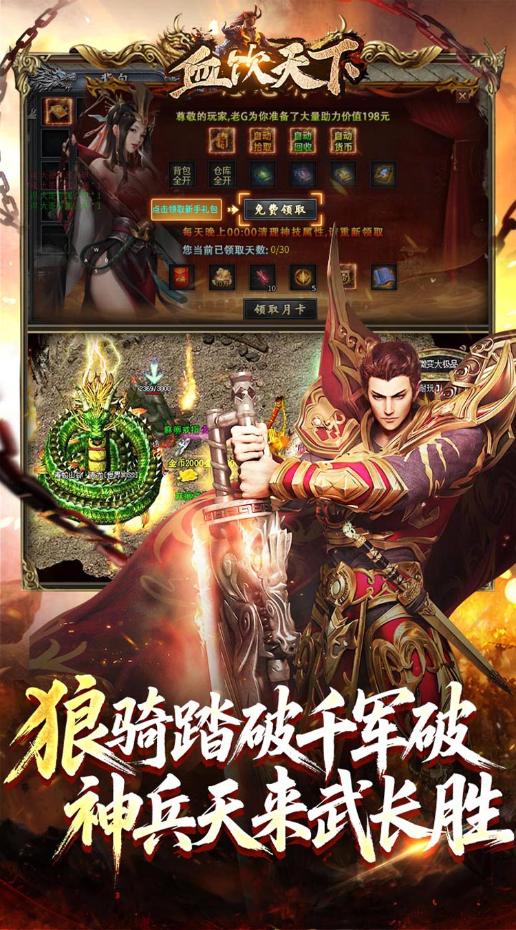 1、上线即送:感恩有你礼包,自动拾取,自动回收,骑术技能,月卡礼包! 2、豪礼相送,策马奔腾! 3、千骑卷平沙,春秋赏猎客! 4、狼骑踏破千军破,神兵天来武长胜! 5、横空断裂百战兵,万古长青第一剑! 6、铁骑先锋,沙城古境,攻无不克,百战百胜!