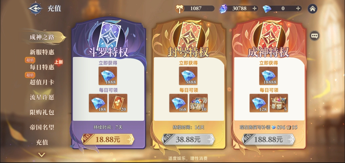 1000 :双月卡 + 成神之路18.88元+成神之路38.88元+成神之路188.88元+每日特惠 +每日7元代金+每日6.88元+9.88元+16.88元档位钻石+新服特惠